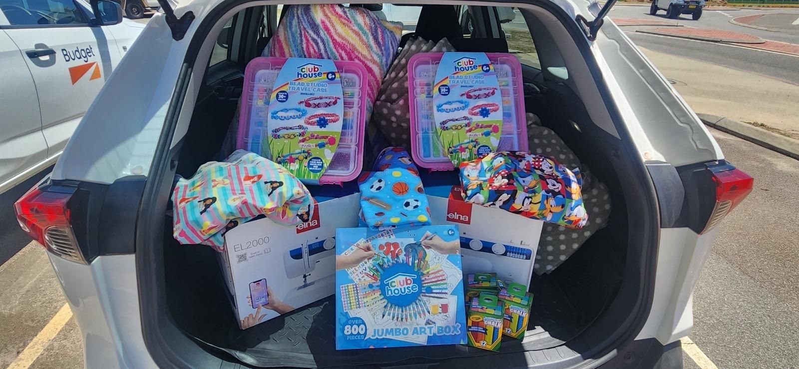 The donation included sporting equipment, sewing machines and fabric, arts and crafts supplies, and cricket and soccer sets.